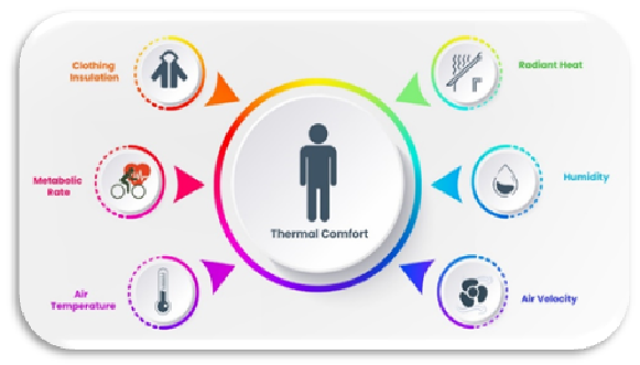 Thermal comfort is the condition of mind that expresses satisfaction with the thermal environment and is assessed by subjective evaluation (ANSI/ASHRAE Standard 55). Ensuring Thermal Comfort in Commercial and Residential Buildings involves monitoring and regulating specific parameters such as temperature and humidity. ASHRAE 55 and ISO7730 provide certain indices for Thermal comfort (PMV/PPD/EDT/SET).